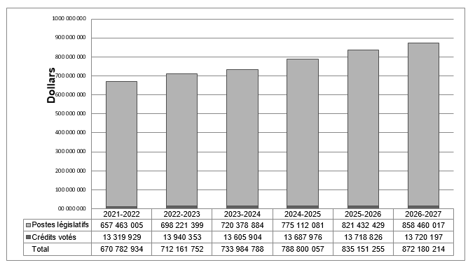 En 2023-2024, les dépenses totales prévues comprennent 719,3 millions de dollars pour les salaires des juges de nomination fédérale ainsi que les dépenses liées à leurs indemnités et à leurs pensions; 13,1 millions de dollars pour le personnel et les coûts de fonctionnement du CMF; et 3,4 millions de dollars pour le personnel et les coûts de fonctionnement du CCM. Les montants pour 2024-2025 sont respectivement de 774 millions de dollars, 12,8 millions de dollars et 3,3 millions de dollars.