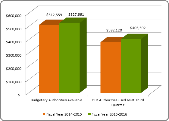 As at December 31, 2014 and 2015, FJA planned to spend $512,559,074 in 2014-15 and $527,661,533 in 2015-16. Authorities used as at the third quarter totalled $382,120,376 in 2014-15 and $405,592,285 in 2015-16.