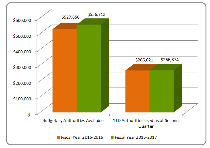 As at September 30, 2015 and 2016, FJA planned to spend $527,656,386 in 2015-16 and $556,713,410 in 2016-17.  Authorities used during the first and second quarters totalled $266,021,182 in 2015-16 and $266,873,915 in 2016-17.