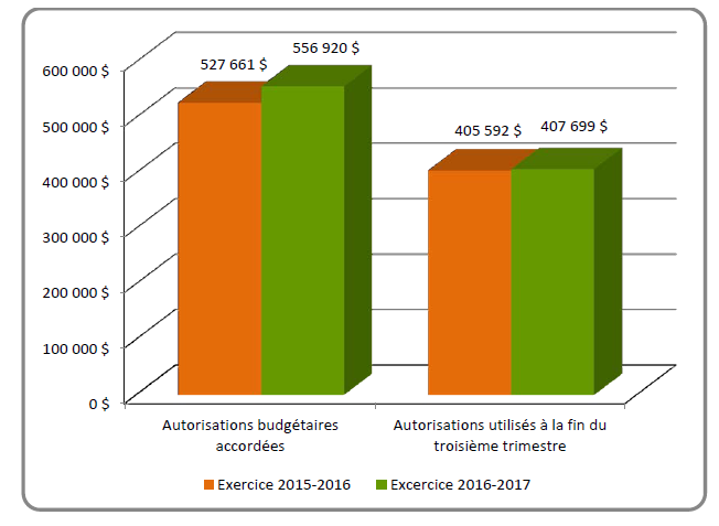 Globalement les dépenses budgétaires trimestrielles et cumulatives à ce jour correspondent à celle de l’exercice précédent. En date du 31 décembre 2016, les dépenses budgétaires totales nettes du ministère avaient augmenté de 0,5% (2,1 millions de dollars) comparativement au même trimestre de l’exercice précédent. Les facteurs suivants expliquent la fluctuation :
