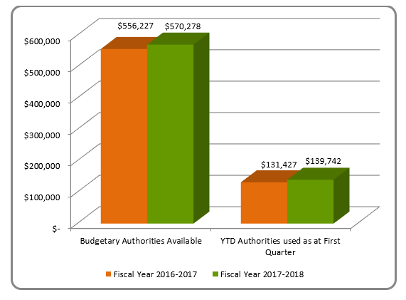 As at June 30, 2016 and 2017, FJA planned to spend $556,226,843 in 2016-17 and $570,277,585 in 2017-18. Authorities used as at the first quarter totalled $131,426,663 in 2016-17 and $139,742,102 in 2017-18.