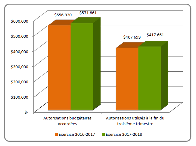 En date du 31 décembre des années 2016 et 2017, le CMF prévoyait dépenser respectivement 556 920 085 dollars en 2016-2017, et 571 861 043 dollars en 2017-2018. Les autorisations utilisées à la fin du troisième trimestre totalisaient 407 699 187 dollars en 2016-2017 et 417 661 315 dollars en 2017-2018.