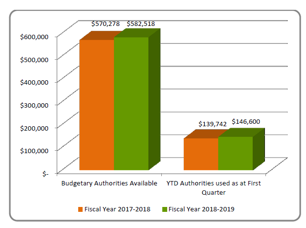 As at June 30, 2017 and 2018, FJA planned to spend $570,277,585 in 2017-18 and $582,518,253 in 2018-19. Authorities used as at the first quarter totalled $139,742,102 in 2017-18 and $146,600,326 in 2018-19.