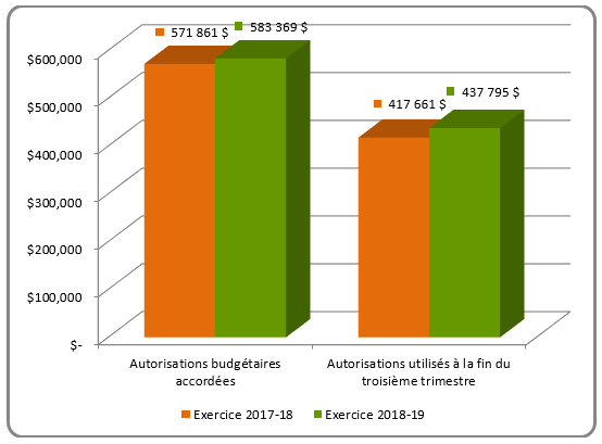 En date du 31 décembre des années 2017 et 2018, le CMF prévoyait dépenser 571 861 043 dollars en 2017-2018, et 583 369 192 dollars en 2018-2019. Les autorisations utilisées à la fin du troisième trimestre totalisaient 417 661 315 dollars en 2017-2018 et 437 795 722 dollars en 2018-2019.