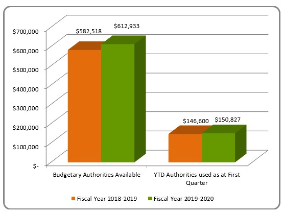 As at June 30, 2018 and 2019, FJA planned to spend $582,518,253 in 2018-19 and $612,932,991 in 2019-20. Authorities used as at the first quarter totalled $146,600,326 in 2018-19 and $150,826,834 in 2019-20.