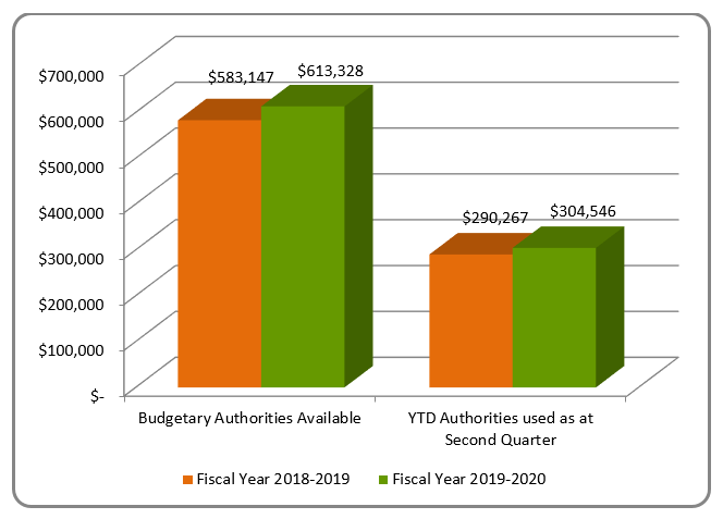 As at September 30, 2018 and 2019, FJA planned to spend $583,147,223 in 2018-19 and $613,328,165 in 2019-20. Authorities used as at the second quarter totalled $290,267,119 in 2018-19 and $304,545,562 in 2019-20.