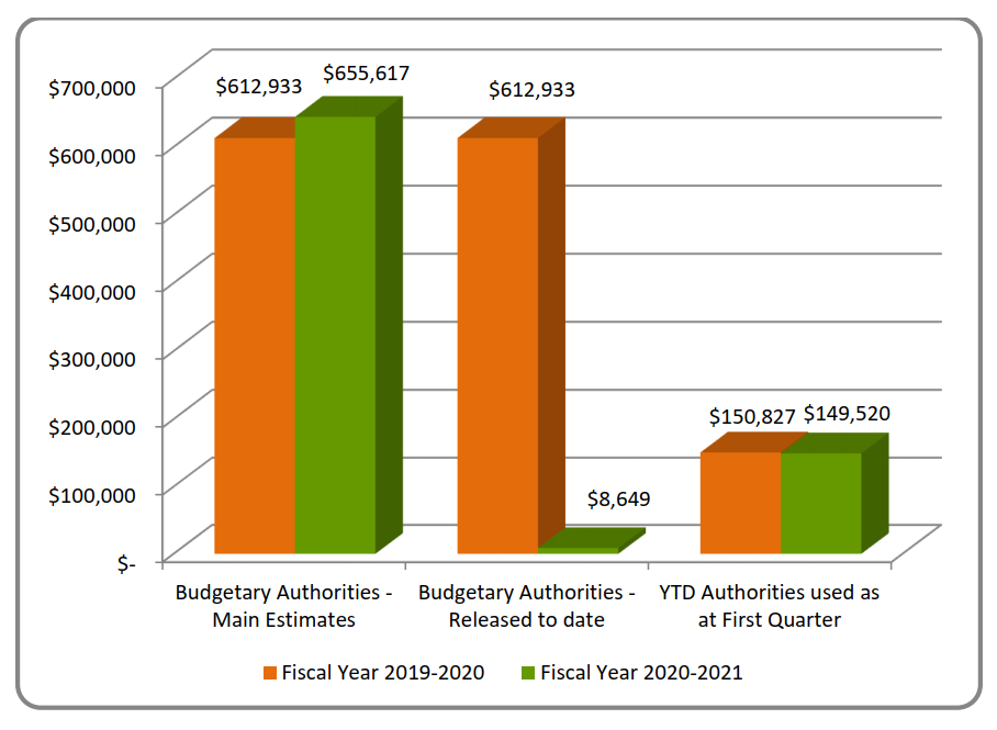 As at June 30, 2019 and 2020, FJA planned to spend $612,932,991 in 2019-20 and $655,616,954 in 2020-21. Authorities used as at the first quarter totalled $150,826,834 in 2019-20 and $ 149,519,793 in 2020-21.