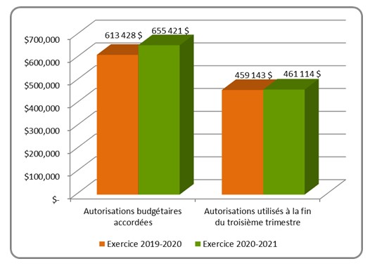 · Une augmentation de 0,1 million de dollars en autorisations de fonctionnement, principalement lié à l’obtention des fonds du report du budget de fonctionnement à la fin de l’exercice de 2019-2020, par comparaison aux fonds reçus lors de l’exercice précédent.