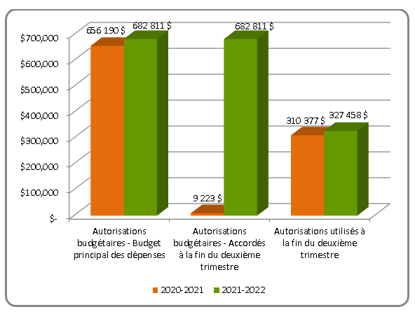 En date du 30 septembre des années 2020 et 2021, le CMF prévoyait dépenser 656 190 061 dollars en 2020-2021, et 682 811 164 dollars en 2021-2022. Les autorisations utilisées à la fin du deuxième trimestre totalisaient 310 377 193 dollars en 2020-2021 et 327 458 186 dollars en 2021-2022.