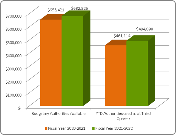 As at December 31, 2020 and 2021, FJA planned to spend $655,421,061 in 2020-21 and $682,926,066 in 2021-22. Authorities used as at the third quarter totalled $461,113,549 in 2020-21 and $494,897,684 in 2021-22.