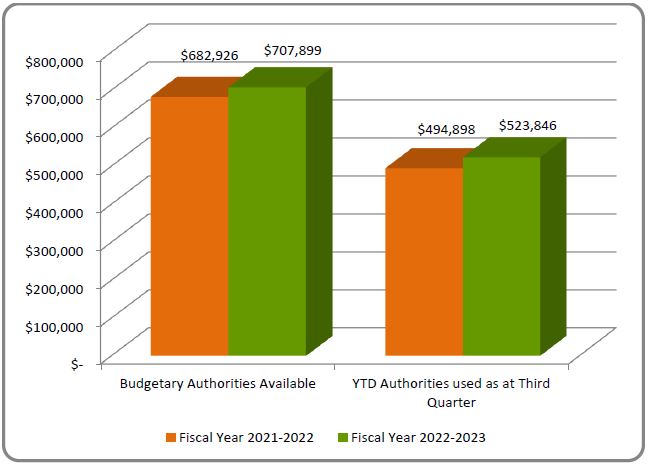 As at December 31, 2021 and 2022, FJA planned to spend $682,926,066 in 2021-22 and $707,899,488 in 2022-23. Authorities used as at the third quarter totalled $494,897,684 in 2021-22 and $523,845,746 in 2022-23.