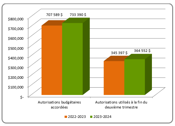 En date du 30 septembre des années 2022 et 2023, le CMF prévoyait dépenser 707 589 166 dollars en 2022-2023, et 733 390 367 dollars en 2032-2024. Les autorisations utilisées à la fin du premier trimestre totalisaient 345 396 546 dollars en 2022-2023 et 364 551 608 dollars en 2023-2024.