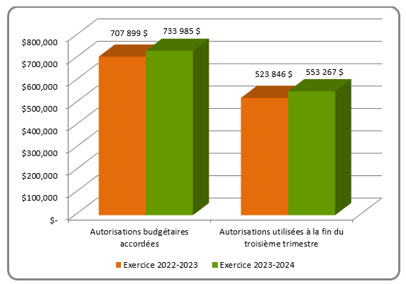 En date du 31 décembre des années 2022 et 2023, le CMF prévoyait dépenser 707 899 488 dollars en 2022-2023, et 733 984 788 dollars en 2032-2024. Les autorisations utilisées à la fin du troisième trimestre totalisaient 523 845 746 dollars en 2022-2023 et 553 266 913 dollars en 2023-2024.