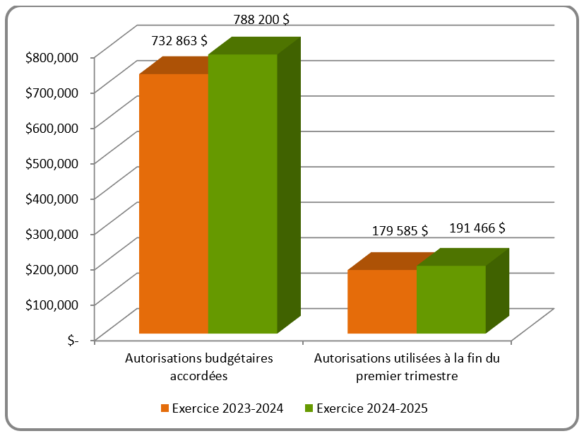 En date du 30 juin des années 2023 et 2024, les autorisations totales disponibles du CMF s’élevaient à 732 863 219 dollars en 2023-2024, et 788 200 057 dollars en 2024-2025. Les autorisations utilisées à la fin du premier trimestre totalisaient 179 584 742 dollars en 2023-2024 et 191 466 374 dollars en 2024-2025.