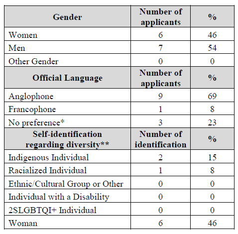 The Advisory Board’s Terms of Reference stipulate that, in establishing a list of three to five qualified and functionally bilingual candidates, members must seek to support the Government of Canada’s efforts to achieve a gender-balanced Supreme Court of Canada that also reflects the diversity of members of Canadian society, including Indigenous peoples, persons with disabilities and members of ethnic, linguistic and other minority communities, including those whose gender identity or sexual orientation differs from that of the majority.